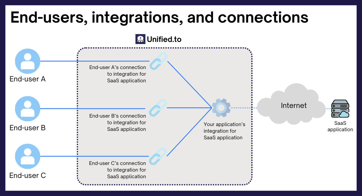 This guide explains how connections work at Unified.to and shows you different ways to create connections for your application. You'll learn about the relationship between your end-users, connections, and integrations, as well as how to get started quickly with test connections.