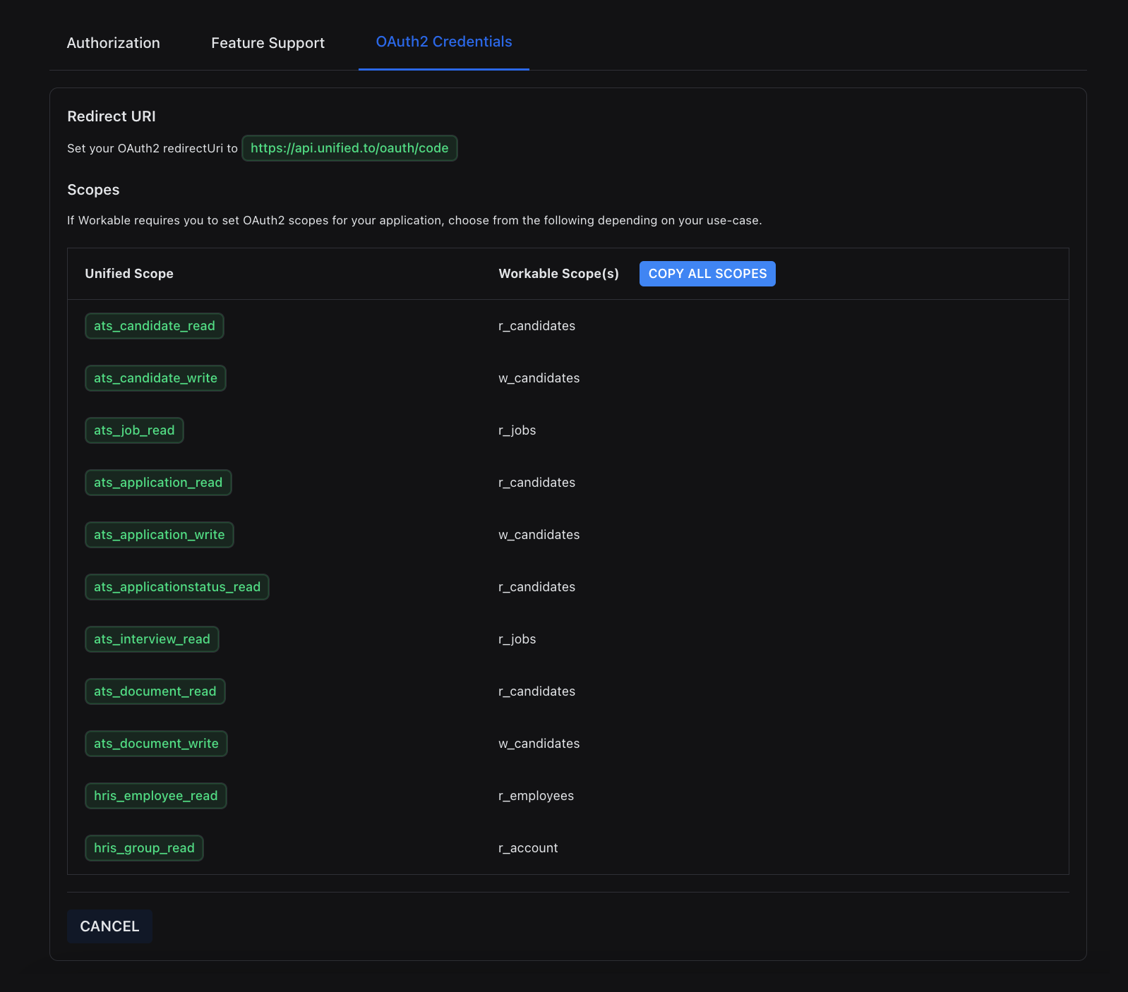 If you want your Workable integration to support OAuth 2, select the OAuth 2 tab to view where to set your OAuth2 redirectUri to and the unified scopes to enable in your application. You may need all or some depending on your use case.