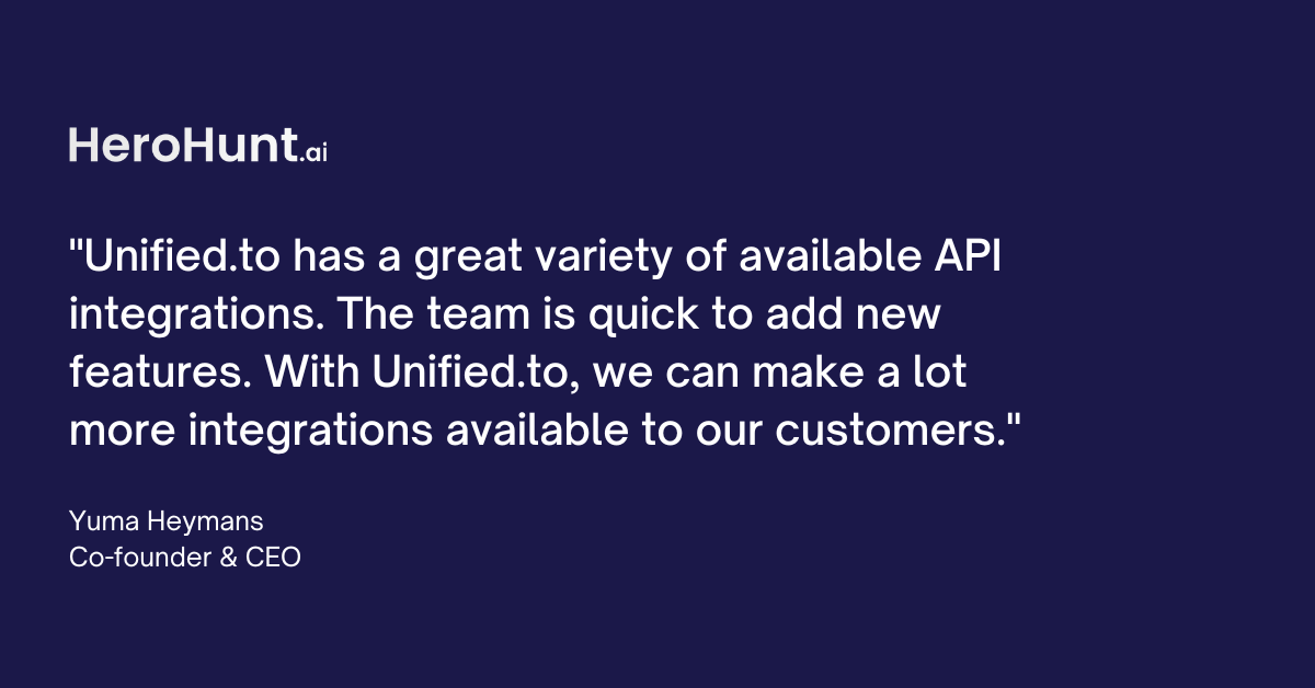 Initially concerned about the potential limitations of Unified API technology, HeroHunt was pleasantly surprised. Unified.to provided the simplicity they sought and exhibited remarkable depth. Unified.to's responsiveness to additional integration and feature requests also demonstrated the adaptability they needed.