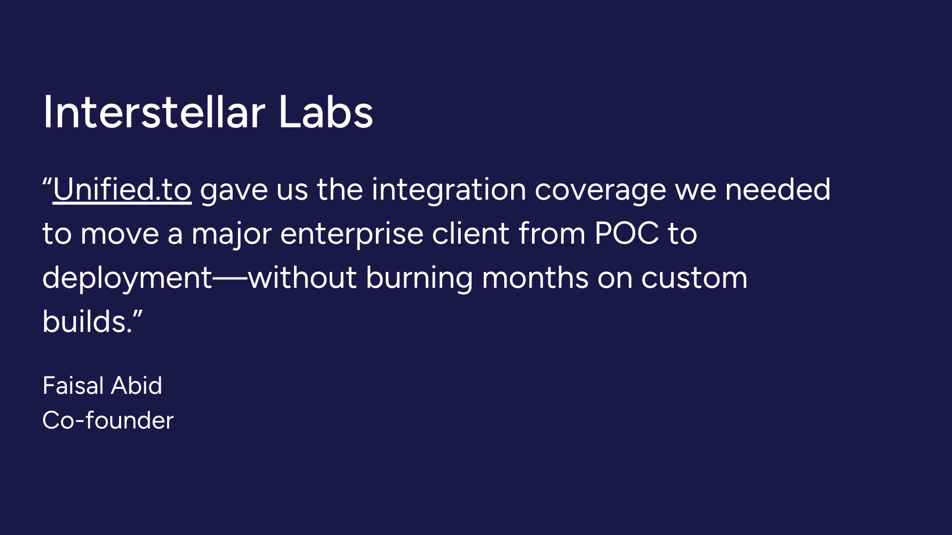 Today, Interstellar Labs no longer worries about integration gaps or maintenance overhead. With Unified.to, they can confidently scale their AI agents across any enterprise stack—faster, more reliably, and with far less engineering effort.