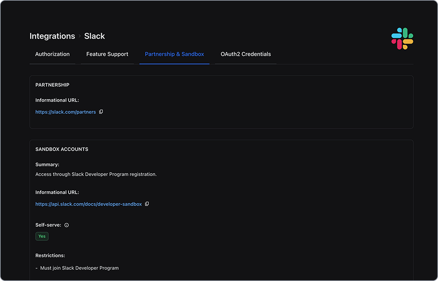 We've added a Partnerships & Sandbox tab to make it easier to get Sandbox access and explore integration-based partnerships. This tab provides clear guidance on how to get started, including links to relevant resources and details on available Sandbox environments.