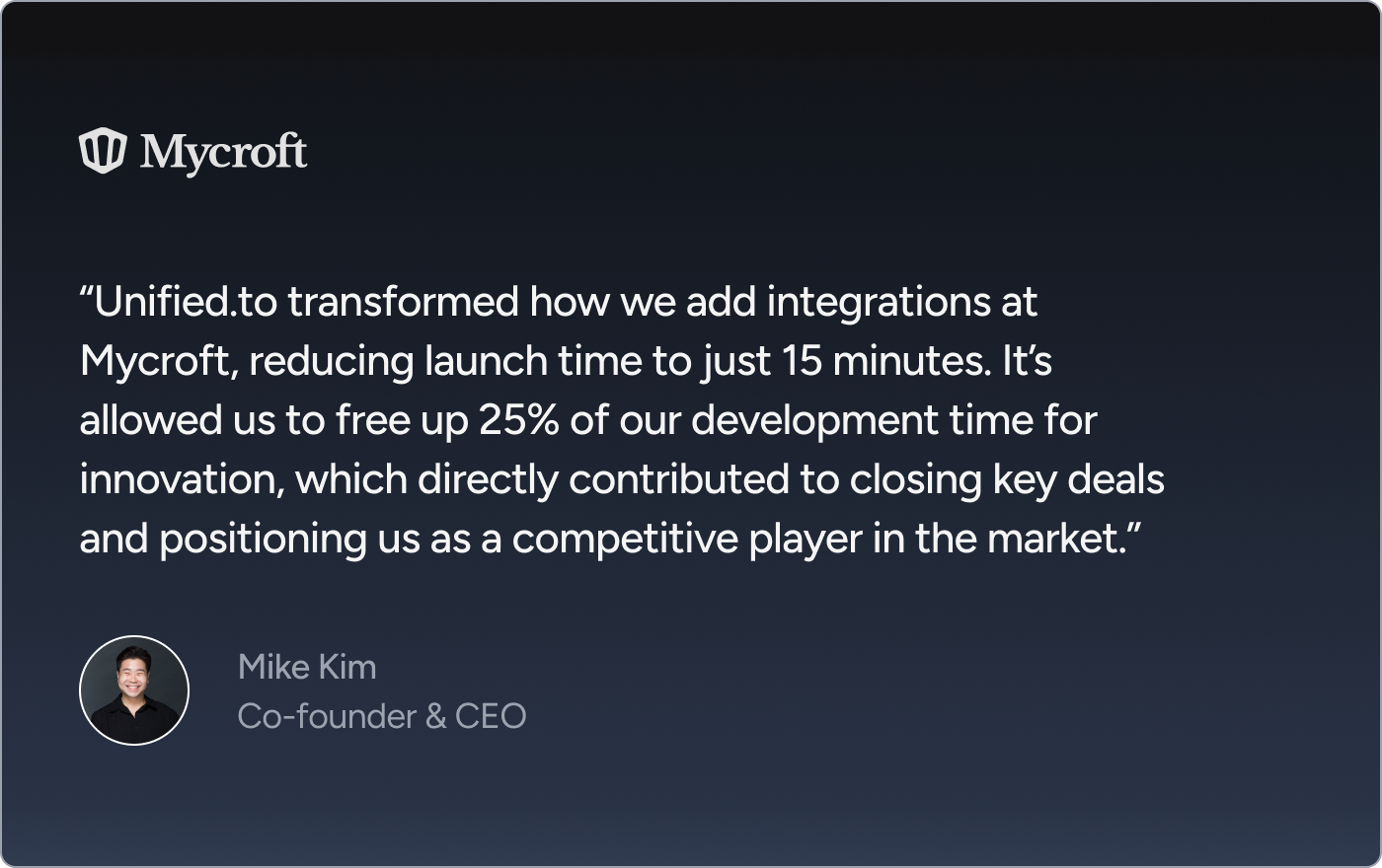 "Unified.to transformed how we add integrations at Mycroft, reducing launch time to just 15 minutes. It's not just about speed — it's allowed us to free up 25% of our development time for innovation, which directly contributed to closing key deals and positioning us as a competitive player in the market."