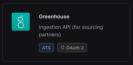 - The second one that appears in the Active Integrations page is for Greenhouse's Candidate Ingestion API, which uses OAuth 2 to authorize your application. This integration is covered in this guide.