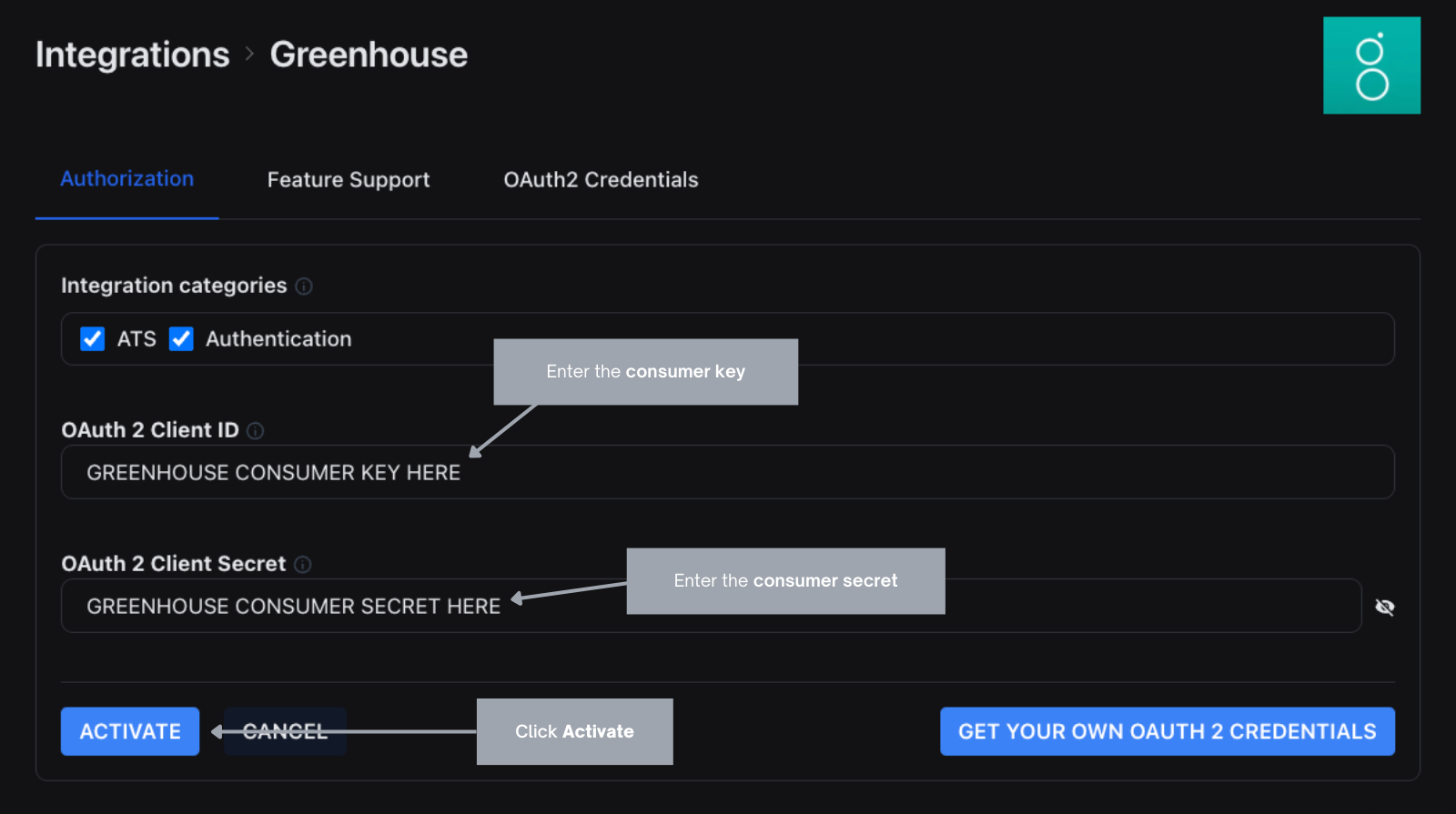 - Click the Activate button to save the changes and activate the Greenhouse integration.