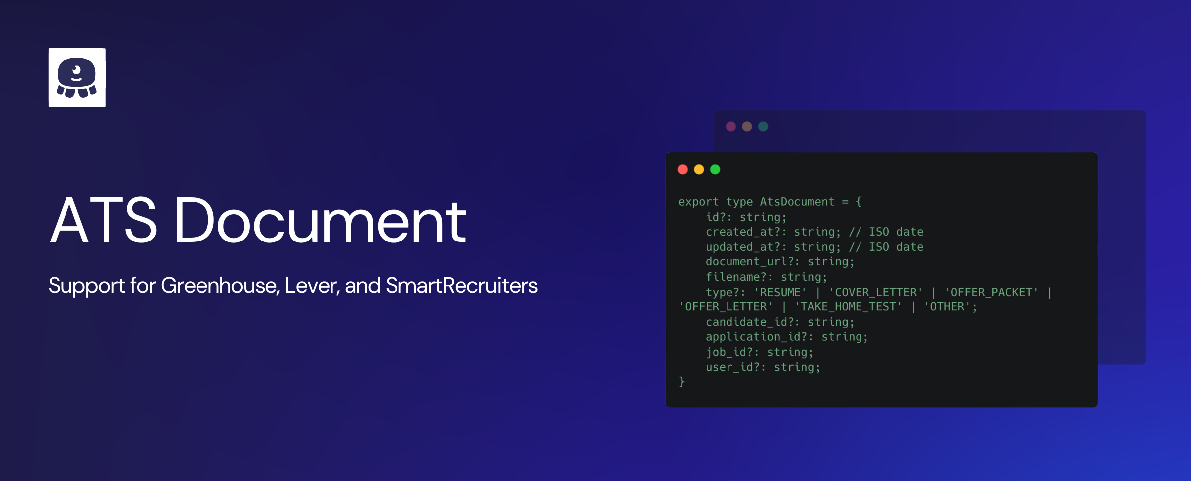 You can now add document management functionality to your SaaS product. We've introduced support for Document across our ATS integrations, which allows you to store candidate resumes, cover letters, background checks, and other assessment documents. Document support is currently available for Greenhouse, Lever, and SmartRecruiters, with additional ATS integrations set to receive the update shortly.
