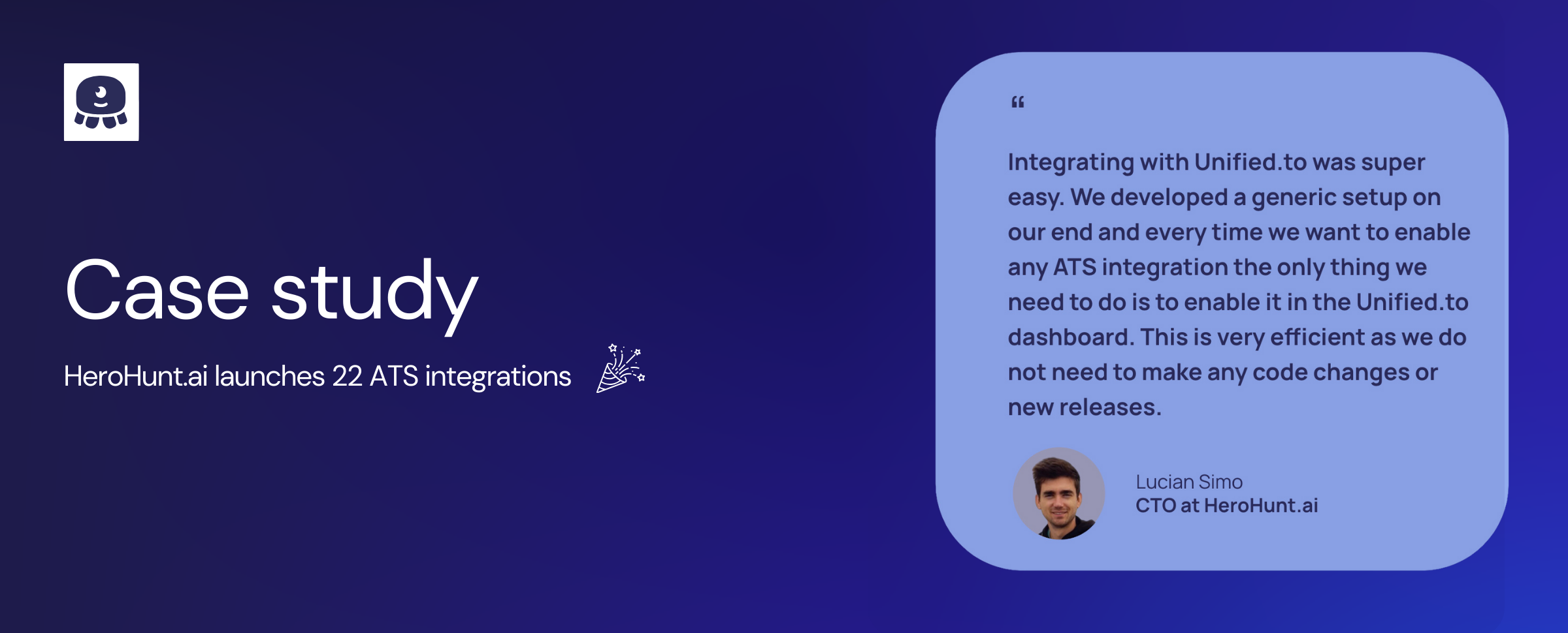 HeroHunt.ai is an AI talent and search engagement platform based in Amsterdam. They first realized the necessity of customer-facing integrations when they began attracting larger companies, which required support for more complex tasks and tech stacks. With Unified.to, they launched 22 ATS integrations with one developer in just one week.